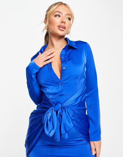 NaaNaa wrap front satin shirt dress in cobalt blue Very well made.