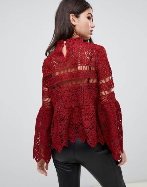 Boohoo crochet lace peplum hem flare sleeve top in red Very well made.