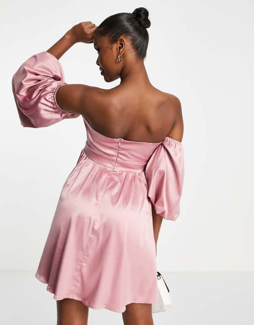 I Saw It First wedding guest bardot skater mini dress in pink satin Very well made.