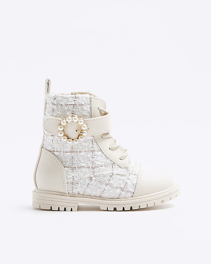 Mini girls cream boucle pearl buckle boots Very well made.