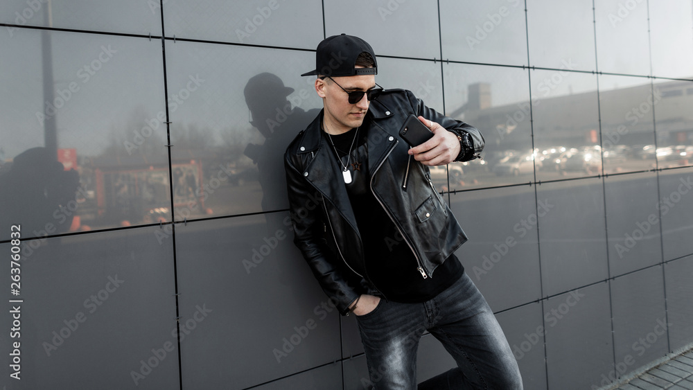 Portrait of Stylish Young Man in Black Leather Jacket and Hat Very well made.