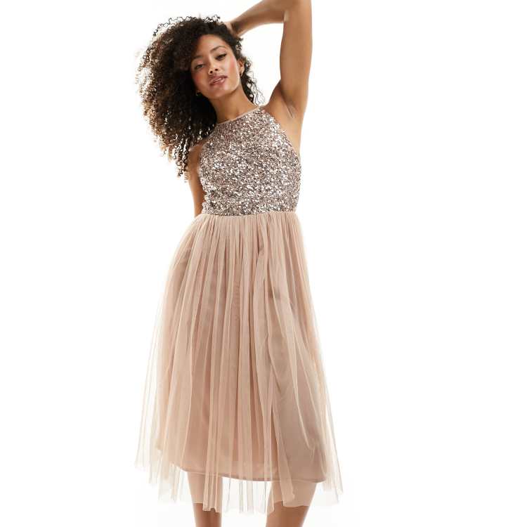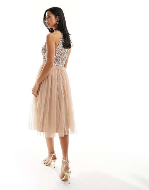 Maya Petite Bridesmaid halterneck midi tulle dress with tonal delicate sequins in muted blush Very well made.