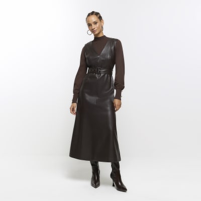 Brown faux leather belted swing midi dress Very well made.
