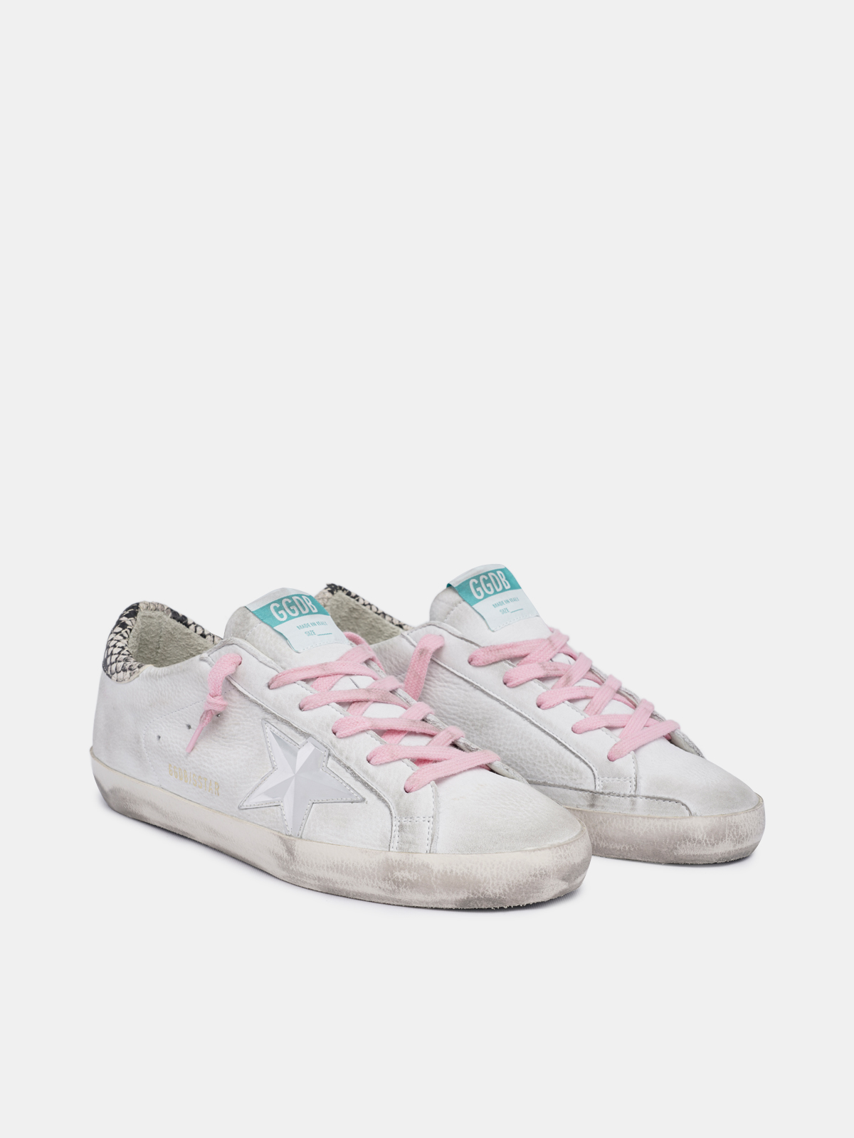 White Super Star sneakers with snake print heel tab Very well made.