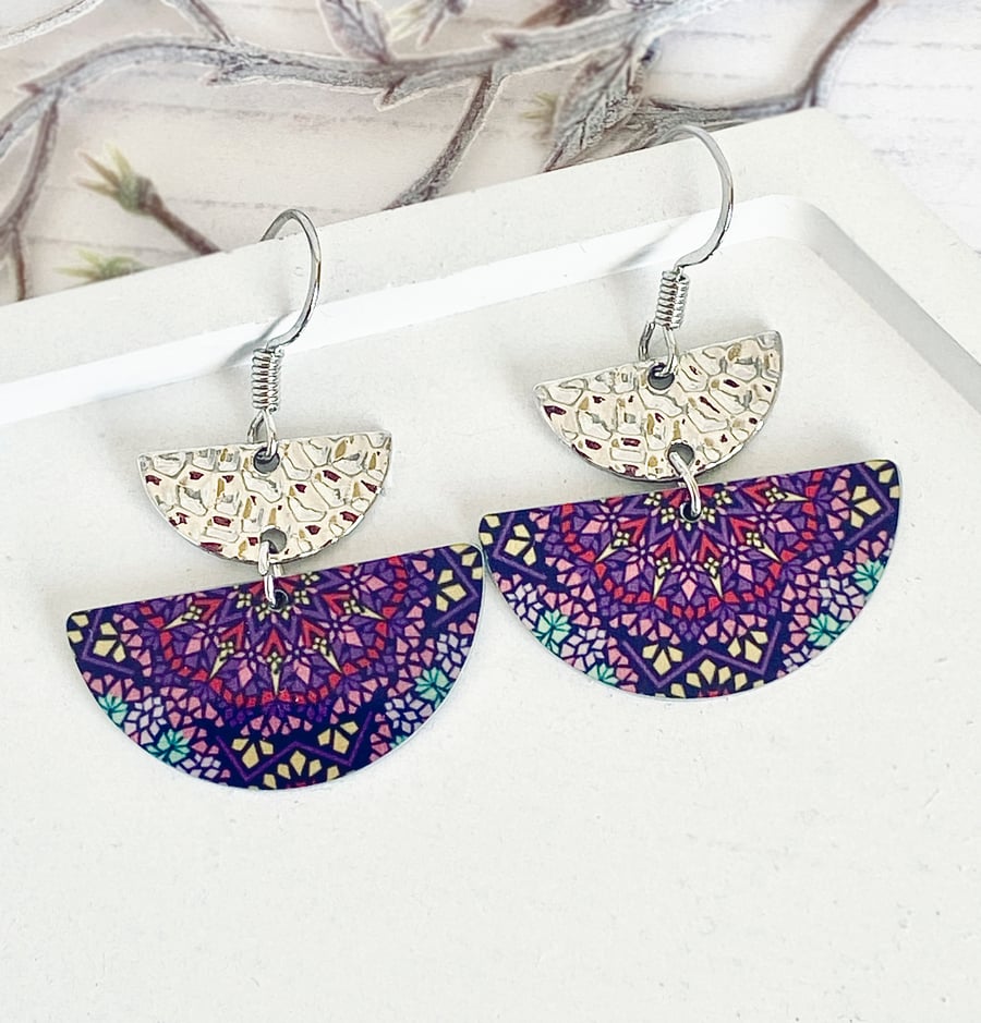 Mandala half circle earrings dangle on sterling silver ear wires. H372 Very well made.