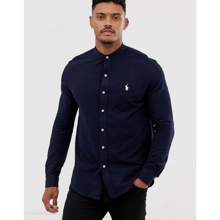Polo Ralph Lauren player logo grandad collar pique shirt slim fit in navy Very well made.