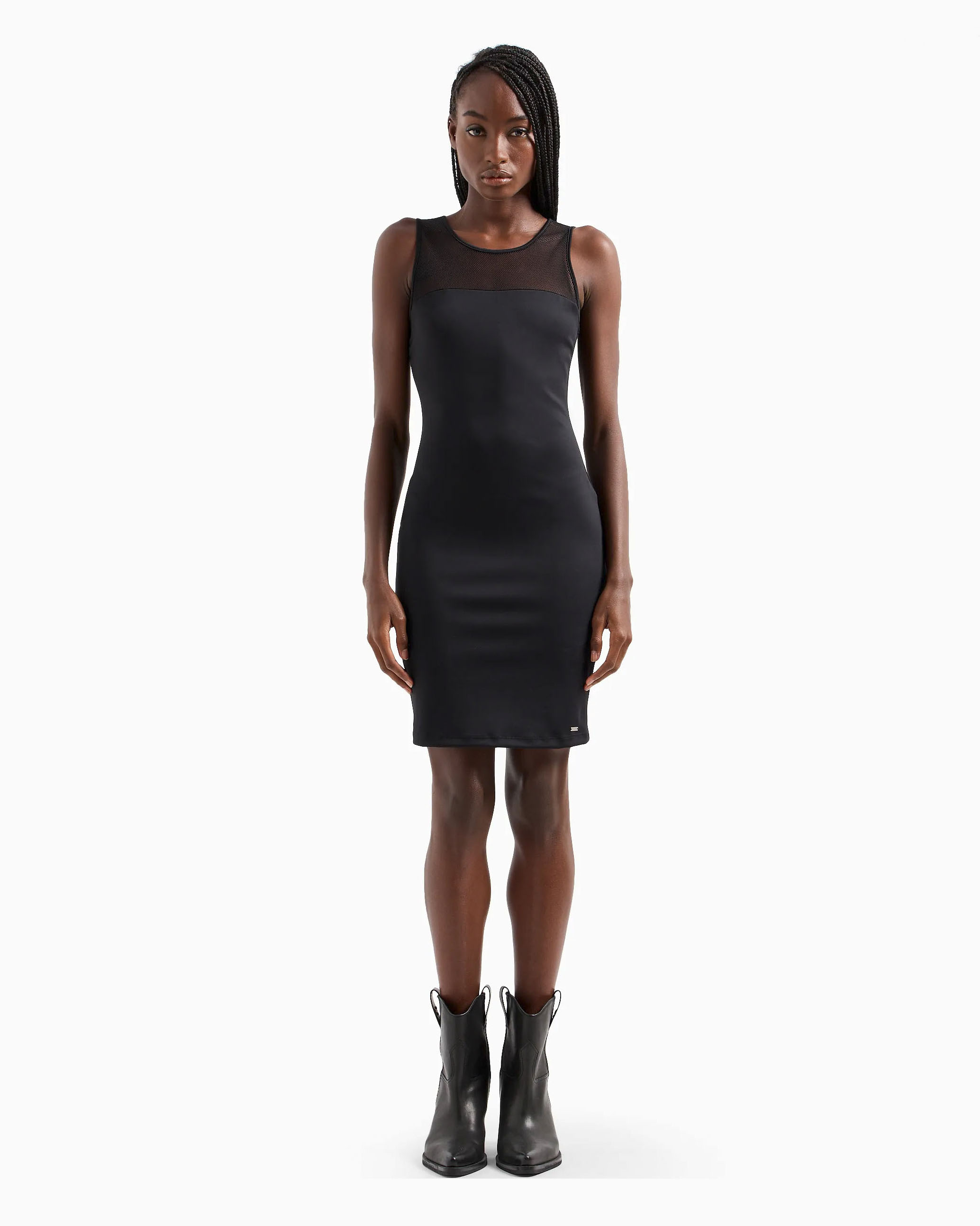 Tubino nero corto in tessuto stretch senza maniche con inserto in rete Very well made.