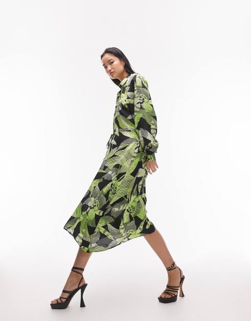 Topshop hanky hem linear floral midi shirt dress in green Very well made.