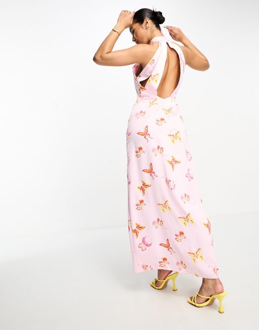 Something New Vestito lungo allacciato al collo in raso rosa confetto con stampa di farfalle e schiena scoperta Very well made.