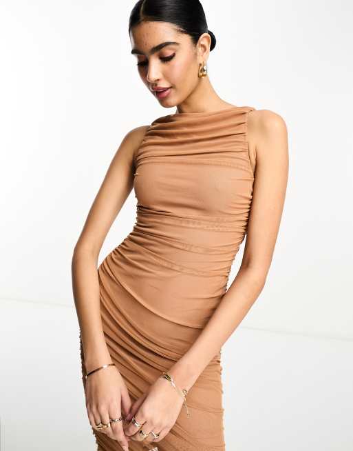 ASOS DESIGN high neck ruched asymmetric bodycon midi dress in camel brown Very well made.