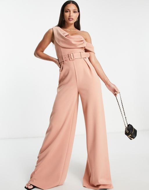 ASOS DESIGN tailored one shoulder kickflare jumpsuit in blush Very well made.