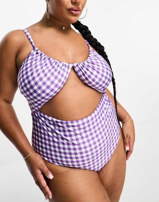 ASOS DESIGN Curve ruched cut out swimsuit in purple check print Very well made.