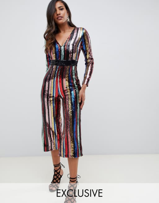 One Above Another wide leg plunge jumpsuit in rainbow stripe sequin Very well made.