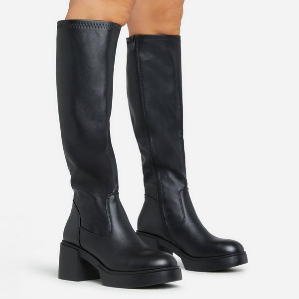 Caesar Chunky Block Heel Knee High Long Boot In Black Faux Leather Very well made.